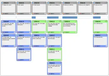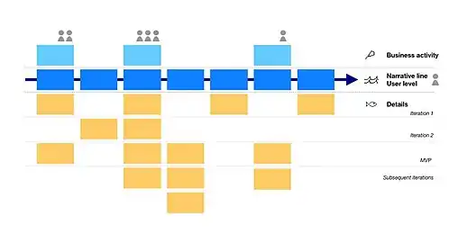 Story maps can easily provide a two-dimensional graphical visualization of the product backlog: At the top of the map are the headings under which stories are grouped, usually referred to as 'epics' (big coarse-grained user stories), 'themes' (collections of related user stories[34]) or 'activities'. These are identified by orienting at the user’s workflow or "the order you'd explain the behavior of the system". Vertically, below the epics, the actual story cards are allocated and ordered by priority. The first horizontal row is a "walking skeleton"[35] and below that represents increasing sophistication.[36]
