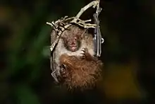 In the spring and autumn, it primarily roosts in clumps of dead leaves, but it also utilizes tree cavities and peeling tree bark.[4] Trees used for roosting include Litsea acuminata (a laurel species), Neolitsea sericea, Camellia sasanqua, Ardisia sieboldii, Cinnamomum camphora, and Ficus superba. Females switch roosts frequently, moving to a new roost every day in one study. It is colonial, with females forming maternity colonies.[6] These colonies last from June to August; the rest of the year, each sex is solitary.[7] These colonies consist of 222 individuals. The frequent roost-switching and variable colony sizes exhibited in maternity colonies suggests a fission-fusion social structure.[6] It is the only known bat that hibernates in snow. In the winter, it has been found roosting within cylindrical or conical holes in snowbanks. It is hypothesized that the bats excavate these cavities themselves. Hibernating within the snow may protect it from predators and prevent water loss; the snow holes likely have a stable thermal environment, as well. The only other mammal species known to hibernate within snow is the polar bear.[4]