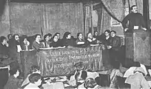 Despite the famine, in September 1931, Molotov sent a secret telegram to communist leaders in the North Caucasus telling them the collection of grain for export was going "disgustingly slowly."[25] In December, he travelled to Kharkiv, then the capital of Ukraine, and, ignoring warnings from local communist leaders about a grain shortage, told them that their failure to meet their target for grain collection was due to their incompetence. He returned to Kharkiv in July 1932, with Lazar Kaganovich, to tell the local communists that there would be no "concessions or vacillations" in the drive to meet targets for exporting grain. This was the first of several actions that led a Kyiv Court of Appeal in 2010 to find Molotov, and Kaganovich, guilty of genocide against the Ukrainian people. On 25 July, the same two men followed up the meeting with a secret telegram ordering the Ukrainian leadership to intensify grain collection.[26]