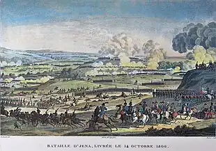 The corps fought at the Battle of Jena on 14 October 1806 during the War of the Fourth Coalition.[6] Ney's troops were engaged in the Siege of Magdeburg beginning on 22 October. General Franz Kasimir von Kleist surrendered on 11 November with 22,000 Prussian soldiers, 800 officers, 20 generals, and 700 artillery pieces.[7] On 25 December, Marchand, with 6,000 men and 12 guns, defeated 3,000 Prussians at the Battle of Soldau.[8] The corps arrived at 7:15 PM on 8 February 1807 at the Battle of Eylau.[9] Ney's 17,000 men held off 63,000 Russians in a brilliant rear guard action in the Battle of Guttstadt-Deppen on 5 and 6 June.[10] The corps led the successful counterattack at the Battle of Friedland on 14 June 1807.[11]