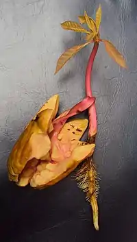 The trees mainly fruit during the south-west monsoon months between July and September, with fruit fall occurring during periods of downpour towards the end of the monsoon. On the trees, fruits may sometimes show an emerged radicle, indicating vivipary. There is no dormancy as the seeds germinate within 1 to 6 days after they fall, retaining the bulky cotyledons for over one week.[10] A study in Sringeri forests, found that seed germination and seedling growth is affected by seed predators and insect herbivores, particularly the latter. In this area, about 91% fruits were attacked by a curculionid weevil and a scolytid beetle (a borer), with eggs, larvae, pupae, and adults of both predators seen in infected fruits.[10] Nevertheless, seed predation, as determined by damage to the growing plumule was low, seen in only 11% of fruits. The weevil was mainly found in the fibrous pericarp about half the time or in the cotyledons (37%), and less often (13%) in the plumule. The scolytid borer mostly targeted the cotyledon (97%) and minimally affected (3%) the fruit pericarp. While cotyledon attacks did not kill seedlings, plumule-infestation led to mortality of seedlings.[10] Insect herbivores killed around 45% of the seedlings. Two species of sap-sucking ants (Pheidole and Pheidolegeton), a leaf-miner of the Dipteran fly family Tipulidae, and the larvae of a Lymantrid moth were the main seedling herbivores, with herbivory by the latter two taxa (leaf miner and moth) often leading to seedling mortality. No vertebrate seed predators or dispersers have been recorded[10]