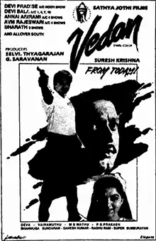 Vedan (transl. Hunter) is a 1993 Indian Tamil-language crime action film directed by Suresh Krissna and produced by Sathya Jyothi Films. The film stars R. Sarathkumar and Khushbu, with Charan Raj, Sarath Babu, Easwari Rao and Radha Ravi in supporting roles. It follows Inspector Vijay as he joins the gang of a notorious criminal, Bhoopathi, under an assumed identity with the sole intention of infiltrating it and also falls in love with his superior officer Ganesh's sister Usha and later witness the slaughter of Ganesh who gave him the task. How Vijay completes the mission even though Bhoopathi has begun to suspect his identity forms the crux of the story. The film was released on 6 May 1993.