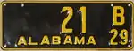 1928–29 | Embossed yellow serial on black plate with border line; "ALABAMA" at bottom, offset to left; "29" at bottom right | none | 123-456A | Coded by horsepower class (A) | |