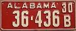 1929–30 | Embossed white serial on red plate with border line; "ALABAMA" at top, offset to left; "30" at top right | none | 123-456A | Coded by horsepower class (A) | |