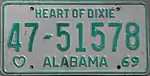 1968–69 | Embossed green serial on reflective white plate with border line; heart shape, "ALABAMA" and "69" at bottom | "HEART OF DIXIE" centered at top | 1-12345 1A-12345 10-12345 |