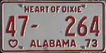1972–73 | Embossed red serial on reflective white plate with border line; heart shape, "ALABAMA" and "73" at bottom | "HEART OF DIXIE" centered at top | 1-12345 1A-12345 10-12345 |