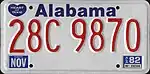 The state first issued annual license plates on October 1, 1911, with plate #1 being issued to the Leak Funeral Home in Montgomery.[1] Until 1980, the license year was October 1 to September 30. Porcelain plates were originally used, before the state switched to embossed metal plates in 1915. The 1916–17 plate was the first to feature the year of expiration, while the 1921–22 plate was the first to use a horsepower class system, with each class denoted by a letter.[3] Kilby Prison near Montgomery took charge of all plate manufacture in 1928.[1]