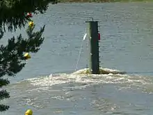 A vehicle snorkel is the land-based equivalent of the submarine snorkel which allows submarines to use diesel engines while submerged.[1] Snorkels, when used by vehicles with air-breathing internal combustion engines, sometimes allow limited deep wading capability for river crossing or amphibious landing operations, particularly in the case of tanks and other armored vehicles.[2] In such cases, the snorkel supplies air for both the engine and the sealed crew compartment, allowing total submersion.[3] Often, the snorkel pipe is of large diameter and fits over the crew hatch, to provide an escape route for the crew in case the vehicle becomes stuck or disabled while underwater.