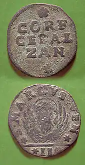 The currency of the islands during Venetian rule was the Venetian lira, as in Venice.[88] There was a special issue for the Islands; the obverse side of it has the complete or shortened inscription CORFU/CEFALONIA/ZANTE in three lines. The reserve depicts the winged and haloed lion of Saint Marc in a front view, holding the book of the Gospel in his fore-paws.[89] The Ionian Islands formed part of the Venetian maritime trade route to the Orient.[90]
