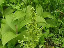 Veratrum viride, known as Indian poke, corn-lily, Indian hellebore, false hellebore, green false hellebore,[2] or giant false-helleborine,[3] is a species of Veratrum native to eastern and western (but not central) North America.[4][2][5] It is extremely toxic, and is considered a pest plant by farmers with livestock. The species has acquired a large number of other common names within its native range, including American false hellebore, American white hellebore, bear corn, big hellebore, corn lily, devil's bite, duck retten, itchweed, poor Annie, blue hellebore and tickleweed.