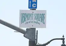 In the 1997, in an effort to distinguish the area from South Central Los Angeles, residents of Vermont Square met with historian Gregory Fischer to discuss neighborhood signage. Fischer had helped design historic signage for the Victoria Park neighborhood. [1][5] Vermont Square signage is installed on Vermont Avenue at King Boulevard.