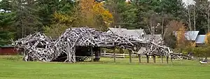 As of July 2010 the State of Vermont and the town of Thetford had weighed in on whether Vermontasaurus was a work of art or a structure that requires a permit.[3] The state Division of Fire Safety prohibited people from being allowed underneath the sculpture, pending the approval of a structural engineer to attest that it was safe to do so. Subsequently, Vermont District Environmental Commission No. 3 granted a permit for the wooden dinosaur, ruling that it had no negative environmental impact under Vermont's Act 250.[4] Despite an initial assertion that the structure would require a building permit, the town of Thetford waived the requirement, ruling that the structure is a work of art.[5][6] The sculpture received confirmation as a permitted use from Thetford's Development Review Board in an August 2010 meeting attended by more than 50 people. The decision was controversial because such a large sculpture was not a use envisioned in the town's ordinances.[7]