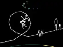 Vib-Ribbon is a rhythm game in which players guide Vibri the rabbit across a line filled with obstacles tied in correspondence to the beat of the song, in a dimension called Music World.[1] Stages contain four basic obstacles; block, loop, wave, and pit, which require players to press the L1, R1, X, or Down buttons respectively at the right time to navigate. Sometimes two obstacles will be merged, requiring the player to press two buttons at the same time (for example, a block and pit combination will require players to press L1 and Down together). Not pushing a button at the right time turns Vibri into a scribbled version of herself temporarily.[2] Getting hit by obstacles too many times will degenerate Vibri from a rabbit into a frog, followed by a worm. Getting hit too many times while in worm form will end the game. Successful actions will help Vibri recover back to her higher forms, and clear enough obstacles in succession while in the rabbit form will evolve Vibri into Super Vibri, increasing the player's score until Vibri is hit.[3]