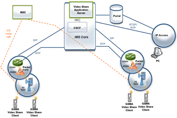 The Video Share service is defined by the GSM Association (GSMA). It is often referred to as a Combinational Service, meaning that the service combines a circuit switch voice call with a packet switch multimedia session. This concept is described in the 3rd Generation Partnership Project (3GPP) specification documents 3GPP TS 22.279, 3GPP TS 23.279 and 3GPP TS 24.279. The Video Share service requires a 3GPP compliant IMS core system.