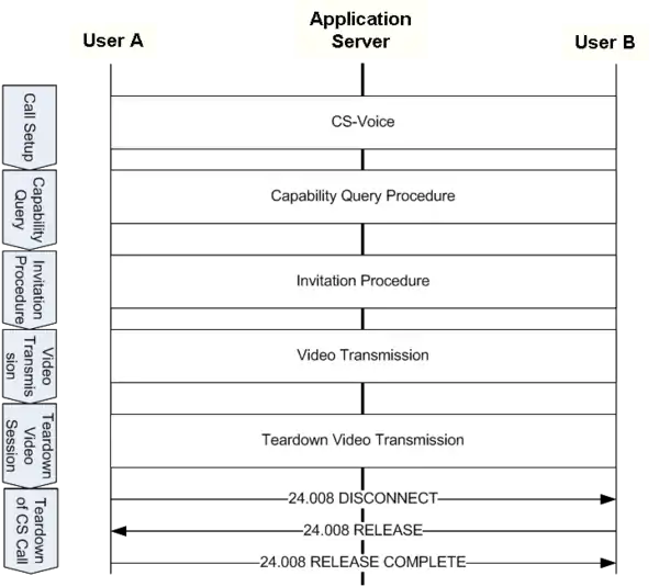 The Video Share session begins with Circuit Switch call between User A and User B. The next step is the Capability Exchange in which the other handset is queried to determine if the recipient is capable of supporting a Video Share session. This is performed with the SIP OPTIONS method. Both handsets can perform this capability exchange. The Video Share session is initiated by sending a SIP INVITE message to the called party.