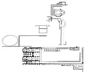 The lower terrace is a long rectangle (100 x 40 m) supported by a wall with massive buttresses, the cladding of which is in opus mixtum of brick latticework.