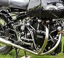The Black Shadow uses a version of the air-cooled four-stroke 50° V-twin engine that powers the Vincent Rapide. Bore and stroke of the undersquare twin are 84 mm and 90 mm respectively, giving a displacement of 998 cc (60.9 cu in). Each cylinder's two overhead valves are operated through rocker arms and short pushrods by two gear-driven cams mounted high in the engine's timing case.[3] The valves have both upper and lower guides, and the rocker arms are forked at the valve end to operate the valve by pushing on a metal shoulder part way along the length of the stem. On Series B and Series C Shadows the spark-plug for the front cylinder is on the right hand side while the one for the rear cylinder is on the left. On Series D bikes both plugs are on the right.[2]: 27 The engine has dry sump lubrication.[4] The electrics on Series D bikes are by Lucas [2]: 48 This included a change to coil ignition and a DKX2A distributor.[2]: 45