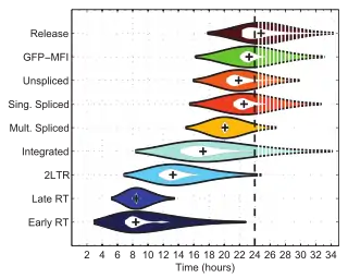 A violin plot is a statistical graphic for comparing probability distributions. It is similar to a box plot, with the addition of a rotated kernel density plot on each side.[1]