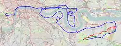 The course begins at three separate points: the 'red start' in southern Greenwich Park on Charlton Way, the 'green start' in St John's Park, and the 'blue start' on Shooter's Hill Road.[22] From these points around Blackheath at 35 m (115 ft) above sea level, south of the River Thames, the route heads east through Charlton. The three courses converge after 4.5 km (2.8 miles) in Woolwich, close to the Royal Artillery Barracks.[22][23]
