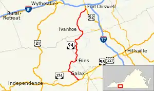 State Route 94 (SR 94) is a primary state highway in the U.S. state of Virginia. Known for much of its length as Ivanhoe Road, the state highway runs 28.39 miles (45.69 km) from U.S. Route 58 (US 58) and US 221 near Galax north to US 52 in Fort Chiswell. SR 94 connects Galax, Wytheville, and Independence (via SR 274) with the communities of Fries and Ivanhoe along the New River, which the highway parallels for much of its length.