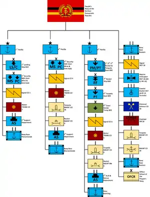 The Volksmarine was headed by the Kommando der Volksmarine (People's Navy HQ Command) in Rostock-Gehlsdorf. It was structured as follows (in 1985):