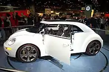 At the 2005 North American International Auto Show, the Volkswagen New Beetle Ragster concept car was introduced. It was supposed to be a preview of the future design of the New Beetle. The base of the Ragster (the name denoting a cross between a "ragtop" and a speedster) was a New Beetle Convertible modified with a new roof, giving it a much lower roofline, and a unique paint job with silver double stripes. The interior differs from the original New Beetle, being a 2+2, and having distinctive control dials. The Ragster's rear-view mirror is mounted on its dashboard,[12] a retro feature, reminiscent of the first Type 1s.