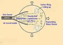 In a typical concept, a blank cartridge is fired into a gun barrel that has a diverging nozzle screwed onto the muzzle.[3] In the nozzle, the short pulse of high pressure gas briefly accelerates to a supersonic exit velocity, whereupon a portion of the exhaust transforms from axial flow into a subsonic, high spin vortex ring with the potential energy to fly hundreds of feet.[4][5]