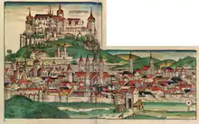A Bronze Age (Urnfield culture) refuge castle, the Celtic Segodunum,[5] and later a Roman fort, stood on the hill known as the Leistenberg,[6] the site of the present Fortress Marienberg. The former Celtic territory was settled by Alamanni in the 4th or 5th century later by the Franks in the 6th to 7th. Würzburg was the seat of a Merovingian duke from about 650. It was Christianized in 686 by Irish missionaries Kilian, Kolonat and Totnan. The city is mentioned in a donation by Duke Hedan II to bishop Willibrord, dated 1 May 704, in castellum Virteburch. The Ravenna Cosmography lists the city as Uburzis at about the same time.[7] The name is presumably of Celtic origin, but based on a folk etymological connection to the German word Würze "herb, spice", the name was Latinized as Herbipolis in the medieval period.[8][9]