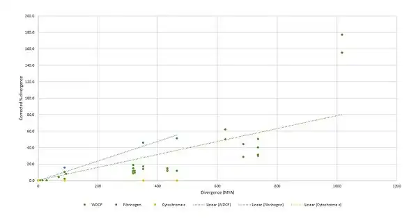 The graph to the right shows the rate of evolution of WDCP in comparison to the evolution rate of the fibrinogen alpha-chain (NCBI: NP_068657) and cytochrome c (NCBI: NP_061820). As seen in the graph to the right, the evolution rate of WDCP is faster than that of cytochrome c, but slower than the evolution of the fibrinogen alpha-chain.