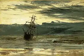 Most of Wyllie's early summers were spent in France with his parents. He began to draw from an early age, and his natural talent was encouraged by his father and by Lionel Smythe, his step brother. He was given a thorough artistic education; first at the Heatherley School of Fine Art, and then in 1866, aged 15, at the Royal Academy Schools. At the Royal Academy he studied under Edwin Henry Landseer, John Everett Millais and Frederic Leighton, among others.[4] He further demonstrated his precocious talent when he won the Turner Gold Medal in 1869 at the age of eighteen with Dawn after a Storm. His other early love affair, which he shared with his younger brother and fellow artist Charles William Wyllie, was sailing.[3]