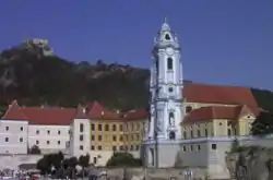 The Abbey complex also part of UNESCO Heritage, located on a forested hill, is few miles away from Krems. The church in the complex has two unconventional towers with flat pyramidal shape. There are also four Tuscan columns built between the towers. It is painted in pink on the exterior, while the interiors are painted in gold, brown and blue colours. The altar built in 1639 is impressive and high and has backdrop of glass windows. The casket of abbey's founder, an ornamental organ front dated to 1703, the Altmann Crypt and the choir stalls are also seen behind the altar.[16]
