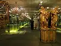 The high altar and the cupola in the church are lighted by natural light, which appears very impressive. The transept in the church has the sarcophagus of St. Koloman. Other impressive features in the church are the statues of apostles Peter and Paul, painting on the ceiling of Holy Trinity flanked by several saints. A recent addition is an altar designed by H. Hunter and F. Frost which was built in 1976 incorporating Baroque interior. The marble hall (in red and grey colour), called the Marmorsaal, which comes after the library, also has baroque interior with marble used only for the door frames. However, this hall which was earlier the Royal dining hall now functions as a centre for formal ceremonies and receptions, and is also part of the museum. This hall has a fresco of Enlightenment made by Paul Troger. The balcony that connects the library and the marble hall provides exceptional views of the Wachu valley amidst the Danube River. The abbey also houses a very impressive museum where monastic treasures are displayed and information on the entire history of Austria is also narrated; an illustrative depiction of the "Melk Cross" of the late medieval period (14th century) is conserved (in the treasury) in the museum. This cross which is studded with precious gem stones such as aquamarine and pearls, along with two other treasures of the abbey namely, the portable altar of Swanhild of the 11th century that depicts life of Christ carved in walrus horn, and a reliquary made of the lower jaw and tooth of St. Koloman, not on regular display in the museum are kept safely in the treasury of the Abbey. These three treasures of the abbey are brought out for display to the public once a year on October 13 which is observed as St. Koloman's Day. The Abbey attracts half million visitors annually.[8][14]