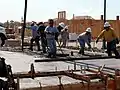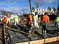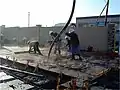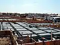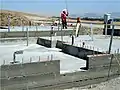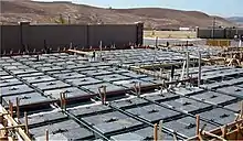 The Wafflemat foundation system, also called a waffle slab foundation, is an above-ground mat foundation used to provide load-bearing capacity on expansive, rocky, compressible, or hydro collapsible soils. The slab is created by placing a series of plastic forms ("Waffleboxes") that are either 8.5 or 12 inches (220 or 300 mm) in height, and 19 by 19 inches (480 mm × 480 mm) in plan, directly on grade to create a waffle-like grid of ribs, and then monolithically pour a post-tensioned reinforced concrete slab over the Waffleboxes. The completed slab then sits on the ground as a 'raft', with the void areas underneath the slab allowing for soil movement.[1]