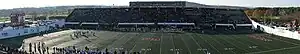 Replacing Alumni Field, the stadium hosted its first game on September 25, 1965, with UMass beating American International College, 41–0. The stadium was officially dedicated on October 16, 1965, when UMass defeated Rhode Island, 30–7, in a homecoming contest. The first sellout came on November 6, 1965, as Massachusetts hosted Holy Cross in front of 17,400 spectators.[7] On November 25, 1972, McGuirk held its largest attendance of 20,000 for the Massachusetts win over Boston College, 28-7.[8] The most recent sellout at the stadium was on September 27, 2014, with a shootout loss against MAC foe Bowling Green, 47–42.[7] The stadium is also the site of UMass Amherst graduation ceremonies, and hosted the 1987 NCAA women’s soccer championship. On April 10, 2009, an Amherst resident fell from the stadium in what police believe was a suicide.[9]