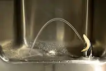 In recent studies, it has been found that some drinking fountains have been contaminated with pathogens such as bacteria. In one study, a virus commonly known to cause diarrhea in young children, known as the rotavirus, has been found on drinking fountains in child day care facilities.[14] Due to cases in the past where children have fallen ill due to coliform bacteria poisoning, many governments have placed strict regulations on drinking fountain designs. The vertical spout design is now illegal in most US jurisdictions. Some governments even require water spouts to be as long as four inches to meet health standards.[11] It is also recommended for young children to allow drinking fountains to run before drinking, as the water may also be contaminated with lead. This is especially common in older buildings with obsolete plumbing.[15] In the 1970s, this fear of contamination in tap water was hyped by producers of bottled water, thereby changing attitudes to publicly provided water in drinking fountains, which began to disappear from city streets.[16]