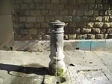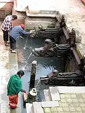 In Nepal there were public drinking fountains at least as early as 550 AD.[2] They are called dhunge dharas or hitis. They consist of carved stone spouts through which water flows uninterrupted from underground sources. They are found extensively in Nepal and some of them are still operational. Many people of Nepal rely on them for their daily water supply.[3] The tutedhara or jahru is another type of old drinking fountain found in Nepal. This is a stone container that can be filled with water and has a tap that can be opened and closed. The oldest of these is dated 530 AD. Very few jahrus are in use today, but the remnants can be found in many places.[4]