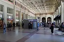 Waterfront's main station building was designed in a neoclassical style, with a symmetrical red-brick facade dominated by a row of smooth, white Ionic order columns. The Ionic columns are repeated in the grand interior hall, flanking the perimeter of the space. The main hall features two large clocks facing each other high on the east and west walls. Paintings depicting various scenic Canadian landscapes, completed in 1916 by Adelaide Langford, line the walls above the columns. The Montreal architecture firm Barott, Blackader and Webster was responsible for designing the main station building.[13]