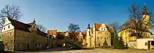 There are several historical buildings, some of which have been refurbished in the last few years. The most prominent is Hubertusburg, which, in spite of its more modest size, and bereft of the grand sweep of terraces-cum-steps of Sanssouci in Potsdam, does have a recognizably similar layout to Sanssouci, with the main building overlooking formal gardens, graveled walkways, outbuildings and a wooded area.