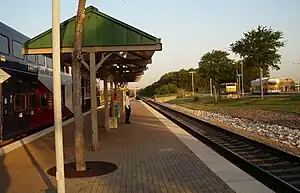 West Irving station is a Trinity Railway Express commuter rail and bus station in Irving, Texas. It is located at Jackson Street near Esters Road and served Irving Mall with connecting bus service to Las Colinas and North Lake College. It opened on November 13, 2000. Unlike many rail stations, West Irving does not have an indoor heating/cooling facility, nor does it have a station attendant. However, it does have passenger shelters for bus and TRE riders.
