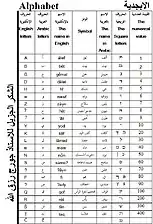 | Arabic letter: | ا | ب | پ | گ | ج | غ | د | ذ | ه | و | ز | ح | خ | ط | ظ | ي | ک | خ | ل | م | ن | س | ع | ف | ص | ض | ق | ر | ش | ت | ث | چ |