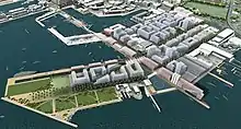 In a next stage, a large 'point park' of 4.25 ha is to be developed on Wynyard Point, with another park strip along the east side of Wynyard Wharf. This larger design followed wide public complaints in 2006 about the new development being dominated by apartments. The layout of the park is also to be decided via an international design competition, and would leave space for a so far unidentified landmark public building. The park would include about 2.4 km of waterfront access, and would be linked with Victoria Park via a 40 m wide tree-lined boulevard and a NZ$5 million pedestrian bridge. This work would likely take place between 2014 and 2017, after commercial leases in the area run out.[10][11] Other areas in the Western Reclamation will remain set aside for marine industry, with the main bulk of land being developed as apartments, with some associated smaller-scale retail and entertainment areas.[14]