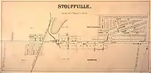 The hamlet of Stouffville grew rapidly in the 1840s, and by 1849, it had "one physician and surgeon, two stores, two taverns, one blacksmith, one waggon maker, one oatmeal mill, one tailor, one shoemaker."[34] The population reached 350 in 1851, 600 in 1866, and 866 in 1881, with a diversity of Mennonite, Methodist, Presbyterian, Episcopal, Baptist and Congregational places of worship.[35] In 1869 Ballantrae had a population of 75, Bloomington 50, Gormley 80, Lemonville 75, and Ringwood 100.[36] In 1876, there was a regular stage coach connection from the hamlet of Stouffville to Ringwood, Ballantrae, Lemonville, Glasgow, Altona and Claremont.[37]