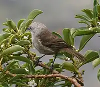 The whitehead (Mohoua albicilla; Māori: pōpokotea) is a small species (15 cm in length, 18.5/14.5 g.[2]) of passerine bird endemic to New Zealand. It is classified in the family Mohouidae. The male whitehead's upperparts, wings and tail are a pale brown in colour, while the head and underparts are white – in the case of the male an almost pure white in colour. Females and juveniles have similar colouration except that the nape and crown (top of the head) are shaded brown.[2][3] The black beak and eyes contrast with the white head and the feet are bluish black in colouration.