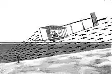 Before returning to Kitty Hawk in the summer of 1901, Wilbur published two articles, "The Angle of Incidence" in The Aeronautical Journal, and "The Horizontal Position During Gliding Flight" in Illustrierte Aeronautische Mitteilungen. The brothers brought all of the material they thought was needed to be self-sufficient at Kitty Hawk. Besides living in tents once again, they built a combination workshop and hangar. Measuring 25 feet (7.6 m) long by 16 feet (4.9 m) wide, the ends opened upward for easy glider access.[36]: 129–130