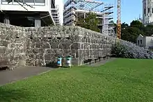 A portion of the stone loopholed Albert Barracks wall survives, registered as no. 12 on the New Zealand Heritage List / Rārangi Kōrero, in grounds of the University of Auckland's city campus.[70]