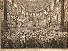 Engraving by Thomas Worlidge of the Sheldonian Theatre on the occasion of the 1759 installation of the Chancellor of Oxford University.