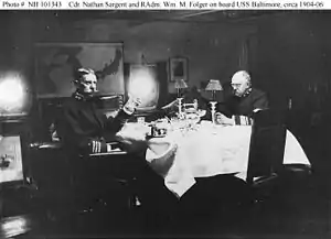 Folger became commander of the Philippine Squadron of the United States Asiatic Fleet in early 1904[8] and was soon promoted to rear admiral, on 1 June 1904.[9] Later in 1904, he took command of the fleet's Cruiser Squadron.[10][11] He served briefly as commander-in-Chief of the Asiatic Fleet from 23 March 1905 to 30 March 1905.[12][13]