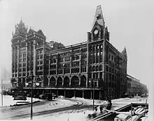 In 1881, the PRR hired the firm to design its main passenger terminal at Broad & Filbert Streets in Center City Philadelphia, directly west of City Hall. This was one of the first steel-framed buildings in America to use masonry not as a structure, but as a curtain wall (as skyscrapers do).[4] The station was widely admired; 15% of the architects in an 1885 poll voted it one of "The Best Ten Buildings in the United States."[5] Eleven years later, the Wilson Brothers' Gothic Revival station was incorporated into Frank Furness's far larger Broad Street Station. The Wilsons designed its new train shed, at the time (1892), the largest single-span train shed in the world.