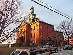 It was built in 1896 for the housing of the Windham County Courthouse and the Willimantic City Government.[2] Before then, the government was held in a rented space in Hayden Block.[3] It is made out of 1.25 million bricks, cost $73,000 (1895) to make, and contains a large clock donated by James Hayden.[4] In 1915 President William Howard Taft visited the building.[5] Warren Richard Briggs was the architect for the building, as he had made other courthouses similar to this in the state. At one point the building house county courtrooms, The city of Willimantic government, the local Grand Army of the Republic group, and the Town of Windham government.[6]