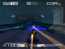 The single race mode awards medals to the top three finishers. Each contestant must reach checkpoints on the course within a certain amount of time, or be ejected from the race. Winning consecutive gold medals unlocks new tracks and crafts.[4] Wipeout 3 features several other game modes, including challenges to complete courses in a set time.[5] In the "Eliminator" mode, players gain points for destroying competitors and finishing laps. The "Tournament" mode has players competing on several tracks, with points being awarded for placement in each race.[7] Players can engage in two-player racing via a split-screen option.[8]